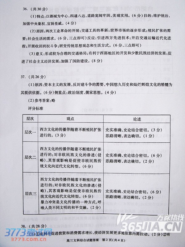 2016安庆三模文综答案及评分标准