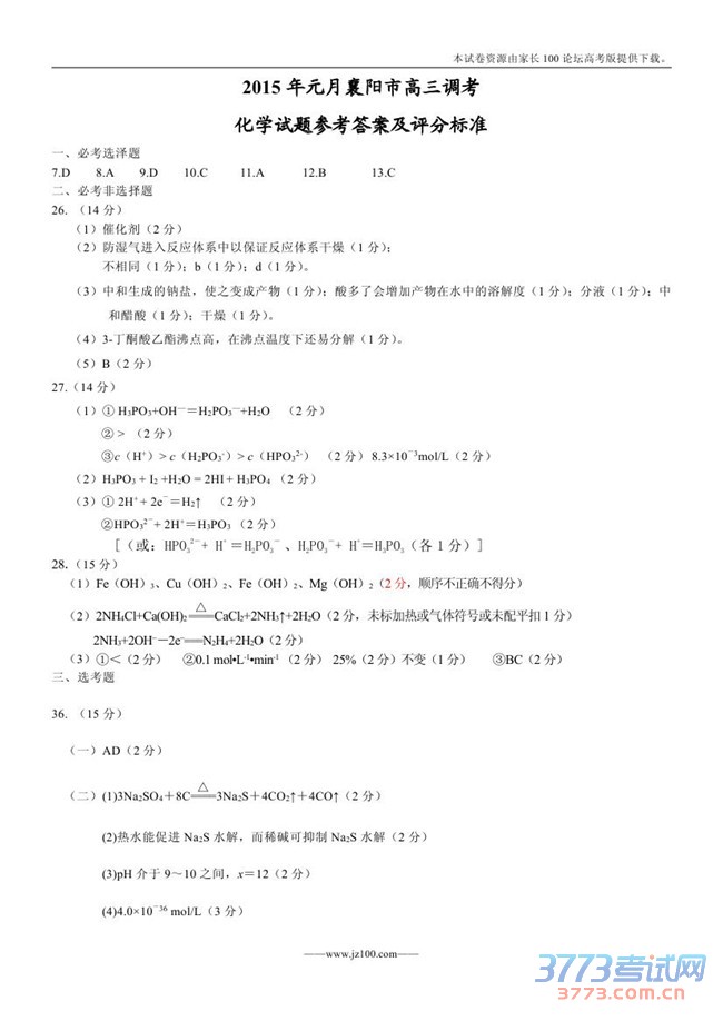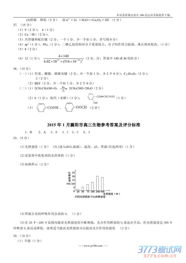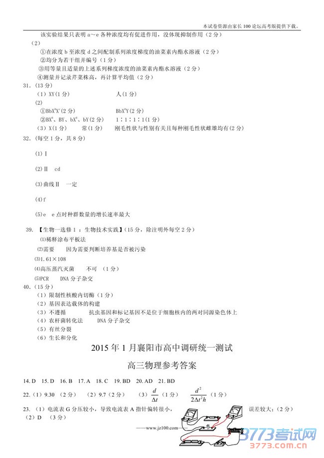2015襄阳高三元月调考理综试题及答案