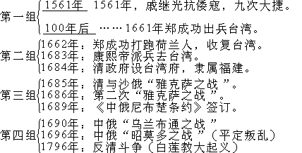 这11个年代,只要记住一个,便可顺势想出其余10个。这个年代可定为1661年,因为这是个特殊年代(中间两个"6"一边一个"1"),很好记。它与1684、1689、1694三个年代,都是有关台湾问题的。(这当中,只需留意郑成功收复台湾与康熙出兵台湾差21年。)然后,康熙就解决东北边疆问题,上一组四个年代关系是"第二年--所谓"马不停蹄"。接着,又引出下一组年代,康熙帝解决西北边疆问题。它与上一组年代的关系也是"第二年",联系十分紧密。这三组年代紧紧相连,概括了康熙政绩的一个侧面。三组九个年代,开头一个(1661年)减100年,即一百年前,是另一位民族英雄戚继光。结尾一个(1696年)加100,即一百年后,爆发了白莲教起义。这样以"1661年"为"龙头",连锁反应,演绎出十个年代。它的好处,不单以少及多,而且由点而线,由线而面,囊括了一大堆史实。