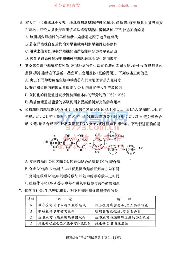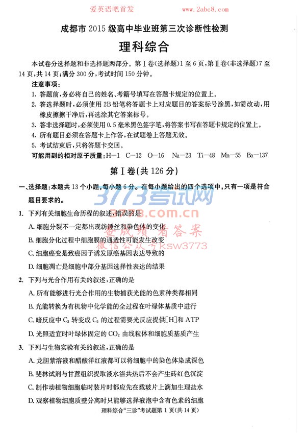 成都市2015级高中毕业班第三次诊断性检测理科综合