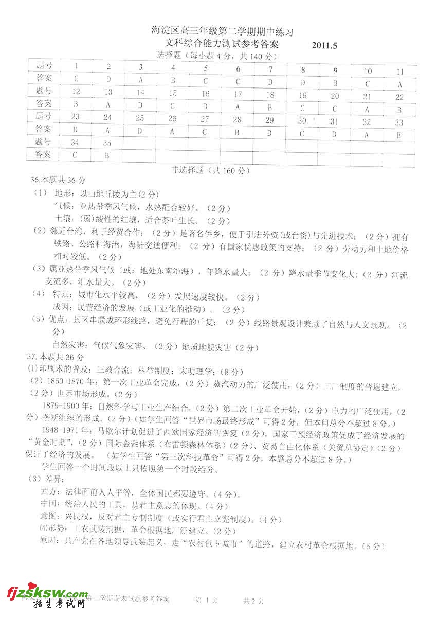 北京海淀2011二模文综试题及答案