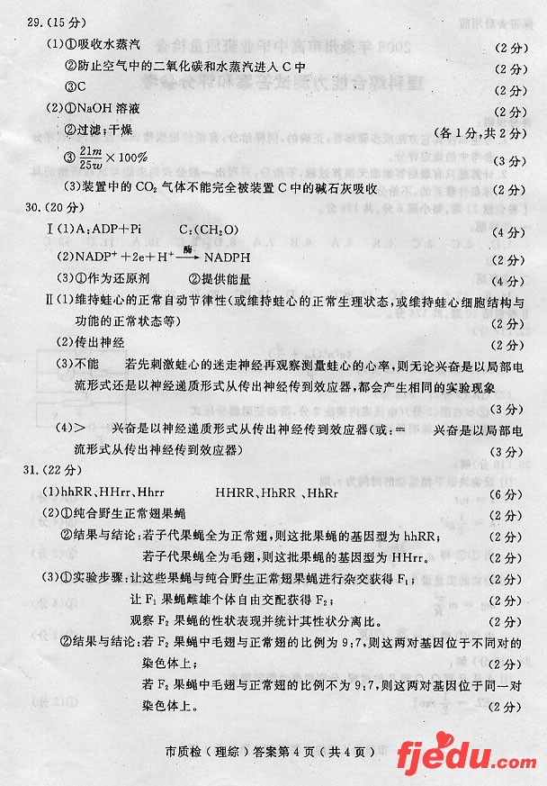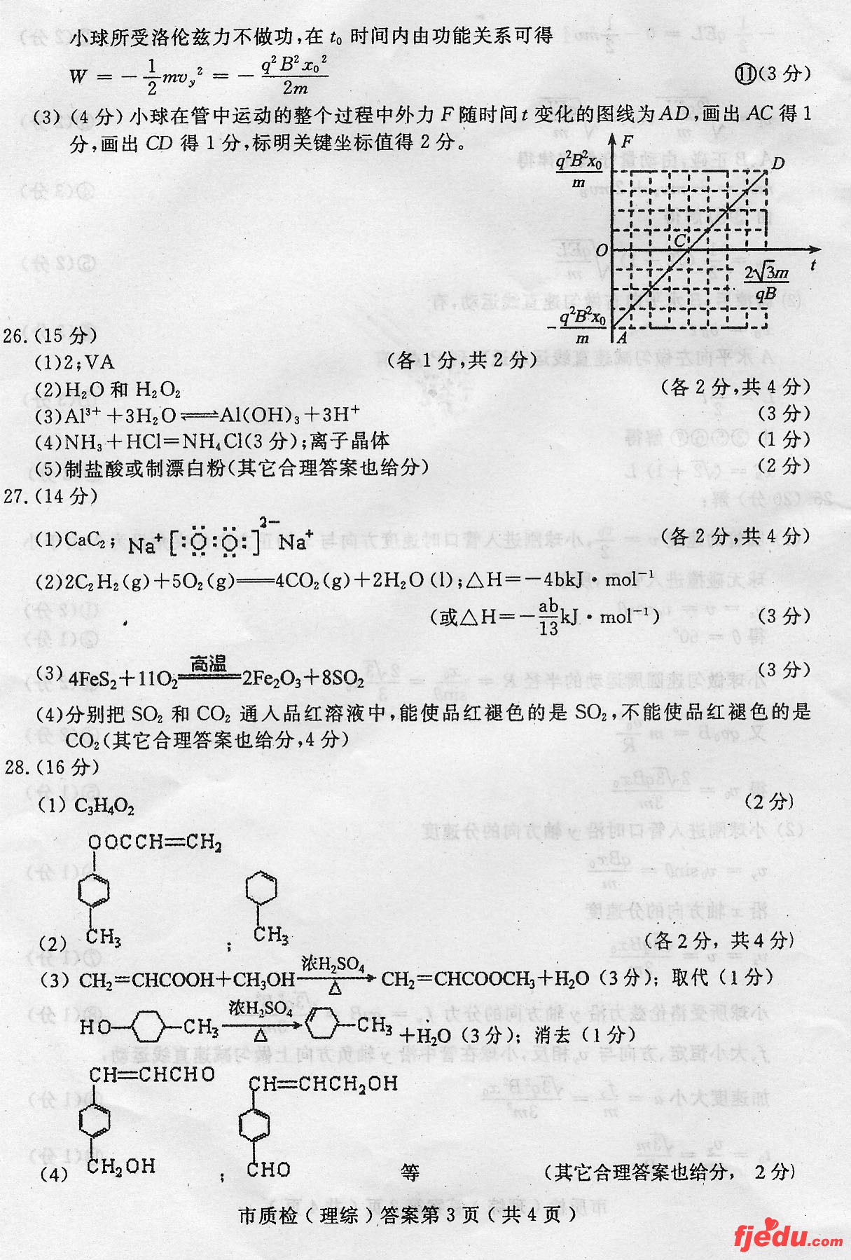 征订2012年福建3+文综/理综质检试卷答案评分标准
