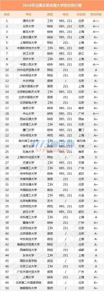 2016全国大学综合排行榜
