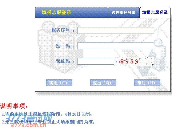填报志愿登录 管理用户登录 填报志愿登录 报名序号 : 密 码 : 验证码 : 管理用户登录填报志愿登录三项考生体育测试考生 说明事项: 1.当前系统处于模拟填报阶段,6月20日关闭; 2.招生院校和招生专业以正式填报期间的为准;