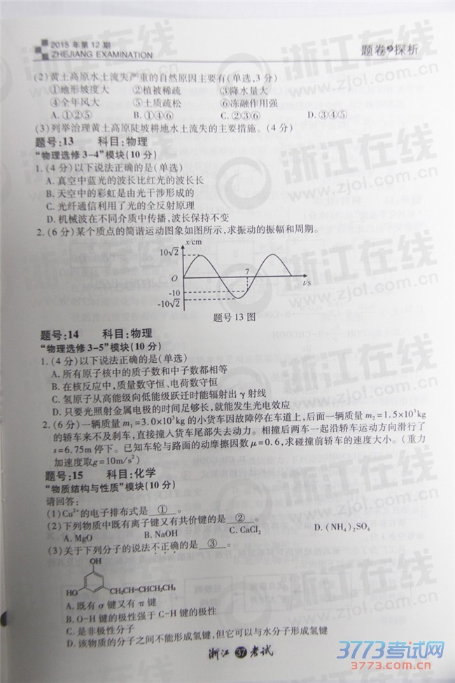 2015浙江高考自选模块试题及答案
