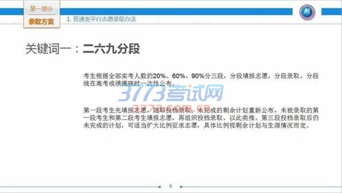 考生根据全部实考人数的20%、60%、90%分三段,分段填报志愿,分段录取。分段线在高考成绩揭晓时一次性公布。