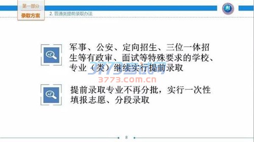 军事、公安、定向招生、三位一体招生等有政审、面试等特殊要求的学校、专业(类)继续实行提前录取。提前录取专业不再分批,实行一次性填报志愿、分段录取。