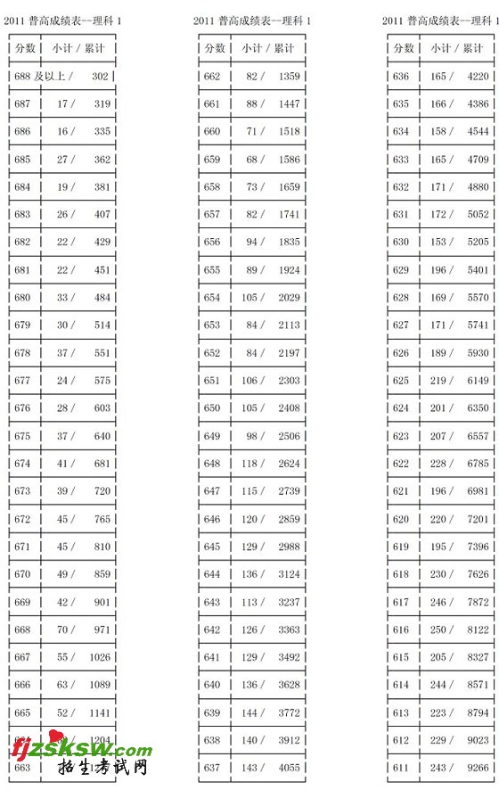 从浙江省教育考试院获悉,2011年浙江省高考理科第一批成绩分段已公布,具体如下:
