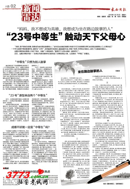 5月26日,东南商报在头版显著位置刊发了《这篇博文被疯传》的大标题,第二版又全文刊发了《“妈妈,我不想成为英雄,我想成为坐在路边鼓掌的人”——“23号中等生”触动天下父母心》的博文。而这篇博文恰恰就是浙江省2012年的高考作文题。