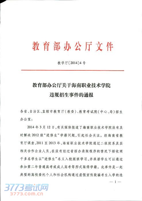 关于海南职业技术学院违规招生事件的通报