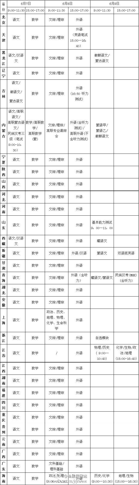 2013年各省高考科目及考试时间汇总