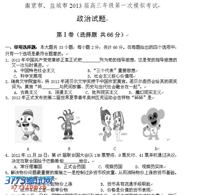 南京盐城2013年高三政治一模考试试题及答案:点击免费下载。