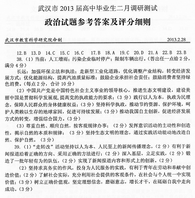 2013武汉市二月调考政治试卷答案