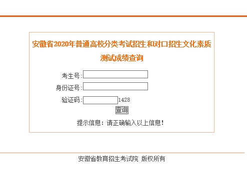 安徽省2020年普通高校分类考试招生和对口招生文化素质测试成绩查询
