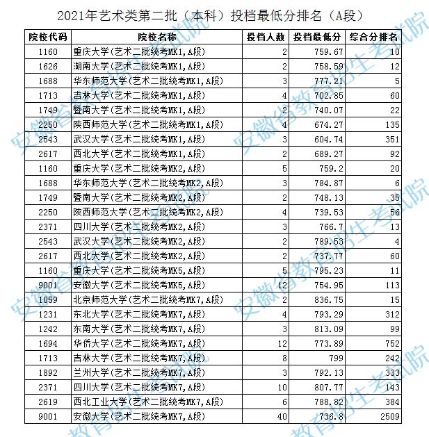 2021安徽艺术类第二批本科投档分数线及排名(A段)