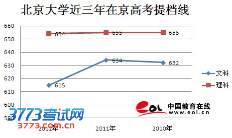 2012年北大理科提档线为654分,文科提档线615分。文科计划招收80人,实际录取106人;理科计划招收140人,实际录取188人。加上此前录取的41名保送生以及31名非通用语种考生,北大2012年在京录取学生总数为366人。