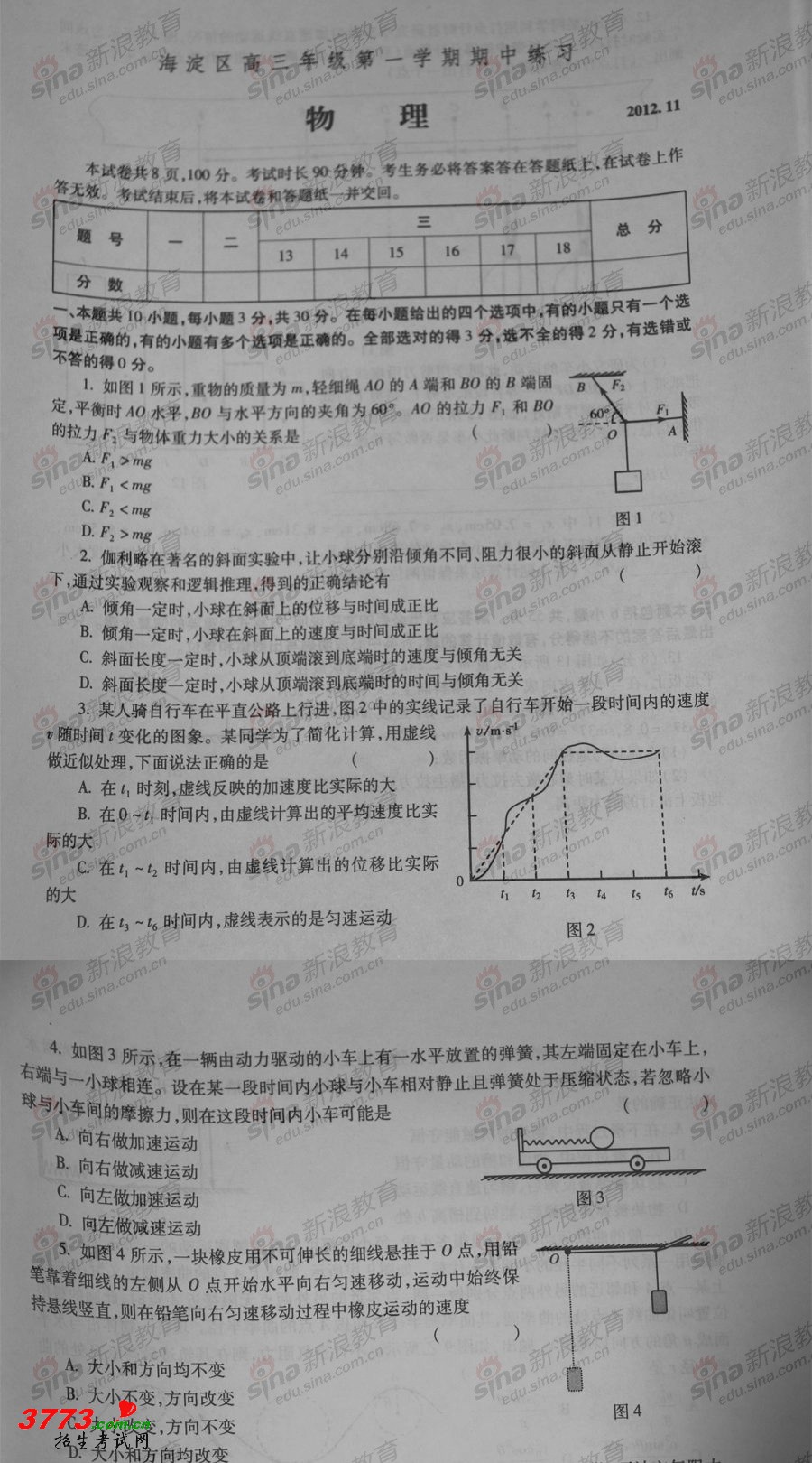 北京市海淀区2012年高三上学期期中考试理科数学试卷答案