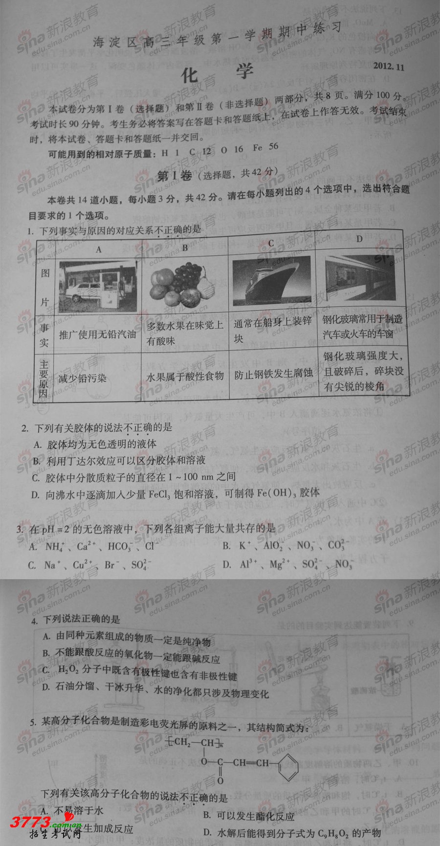 北京市海淀区2012年高三上学期期中数学文科试卷答案