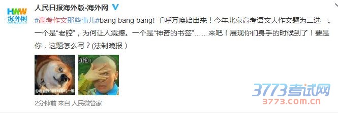 2016年全国高考正在进行,据法治晚报,今年北京高考语文大作文题为二选一。一个是“老腔”,为何让人震撼。一个是“神奇的书签”。