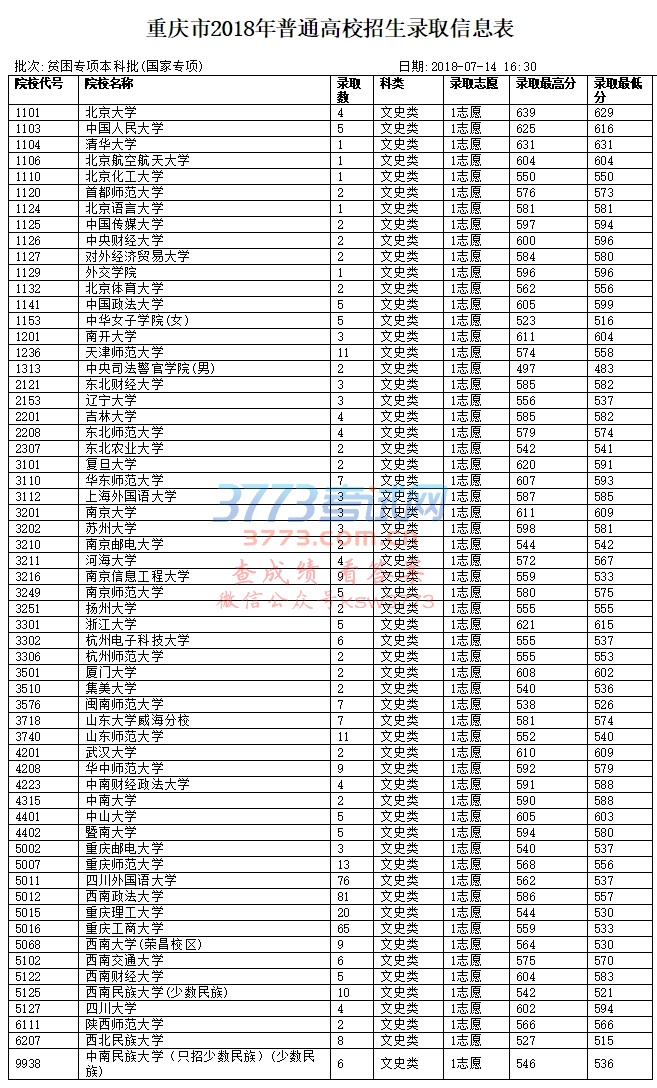 重庆市2018年普通高校招生录取信息表