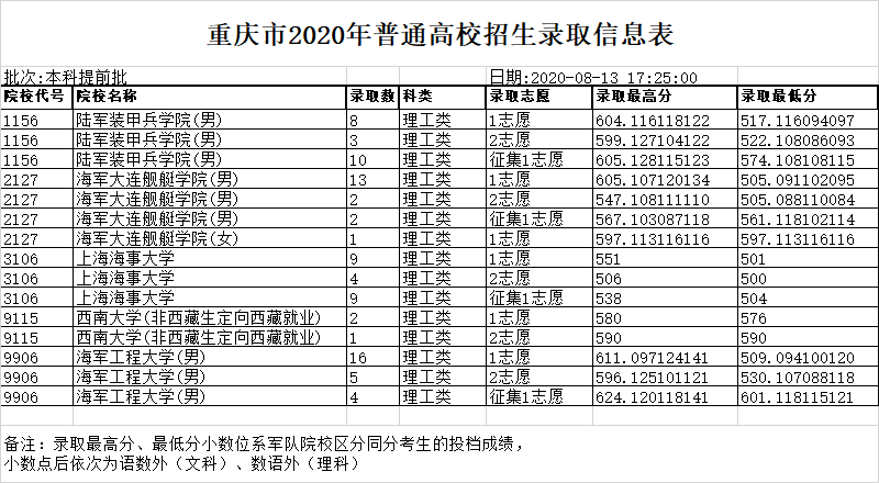 直通录取场 | 重庆市2020年普通高校招生录取信息表 本科提前批(三)