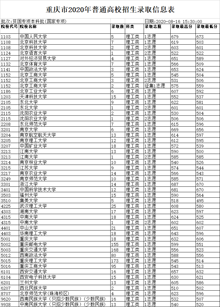 重庆市2020年普通高校招生录取信息表贫困专项本科批(国家专项)理工类二