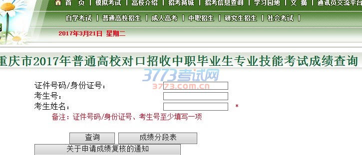 重庆市2017年普通高校对口招收中职毕业生专业技能考试成绩查询