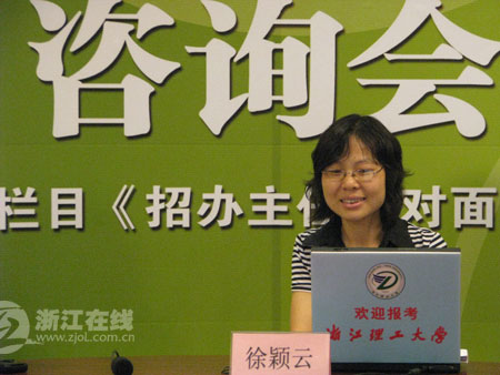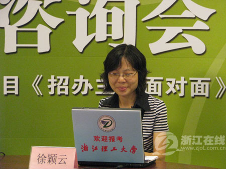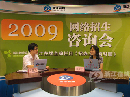 主持人:各位网友大家晚上好,欢迎收看我们的高考咨询节目,我是主持人覃达霖,现在高考结束不久,考生比较关心的大多数是能不能被自己心仪的院校录取,为了使广大的考生能够获得第一手的资讯,我们浙江在线特别开办了《招办主任面对面》特别节目,今天这一场来到我们演播室的是来自浙江理工大学招生就业处处长、招办主任徐颖云老师,徐处长您好!
