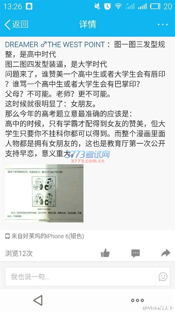 问卷上是一幅漫画,漫画小人拿着考卷在展示,脸上印着唇印、巴掌印。要求考生看图写一篇不少于800字的文章,需结合内容、寓意,自拟标题。