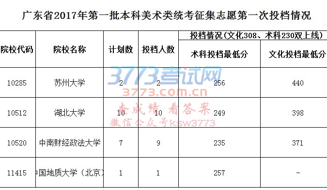 广东省2017年第一批本科美术类统考征集志愿第一次投档情况