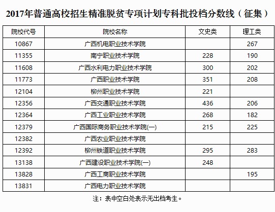 2017年普通高校招生精准脱贫专项计划专科批投档分数线(征集)