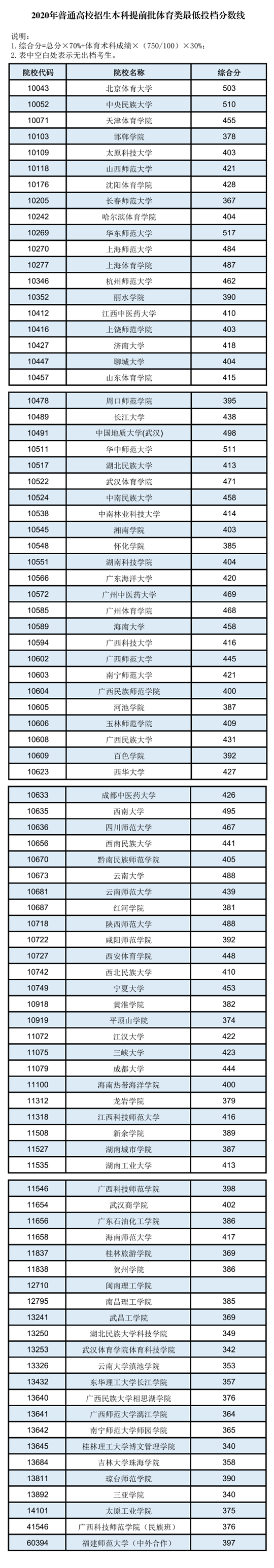 广西:2020年普通高校招生本科提前批体育类最低投档分数线