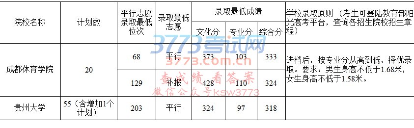 贵州省2017年普通高校招生体育(理)第一批本科院校录取情况(7月11日公布) 序号院校名称计划数平行志愿录取最低位次录取最低志愿录取最低成绩学校录取原则 (考生可登陆教育部阳光高考平台,查询各招生院校招生章程) 文化分专业分综合分 1成都体育学院2068平行373103333进档后,按专业分从高到低,择优录取。要求:男生身高不低于1.68米,女生身高不低于1.58米。 129补报428110324 2贵州大学55(含增加1个计划)203平行32497318