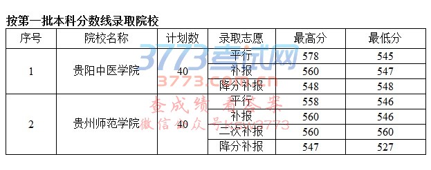 7月17日国家专项录取情况(文史) 按第一批本科分数线录取院校 序号院校名称计划数录取志愿最高分最低分 1贵阳中医学院40平行578545 补报560547 降分补报548548 2贵州师范学院40平行558546 补报560546 二次补报560560 降分补报547527