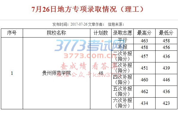 7月26日地方专项录取情况(理工) 序号 院校名称 计划数 录取志愿 最高分 最低分 1 贵州师范学院 48 平行 463 458 补报 458 456 二次补报(降分) 457 436 三次补报(降分) 451 439 四次补报(降分) 460 446 五次补报(降分) 462 436 六次补报(降分) 434 423