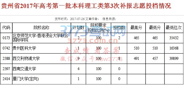 贵州省2017年高考第一批本科理工类第3次补报志愿投档情况