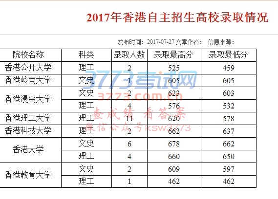 2017年香港自主招生高校录取情况