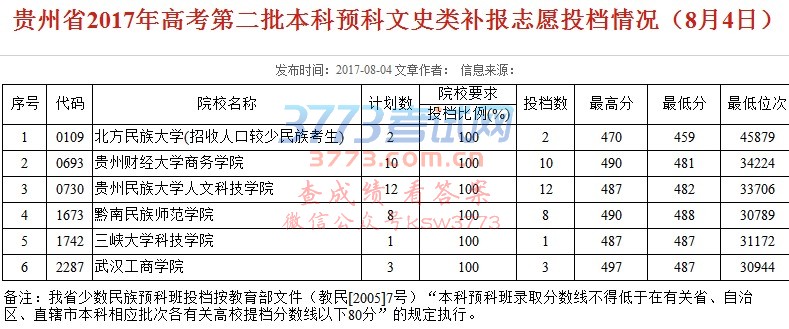 贵州省2017年高考第二批本科预科文史类补报志愿投档情况(8月4日)