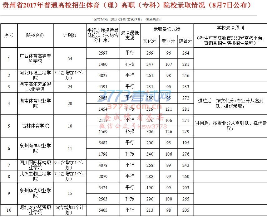 贵州省2017年普通高校招生体育(理)高职(专科)院校录取情况(8月7日公布)
