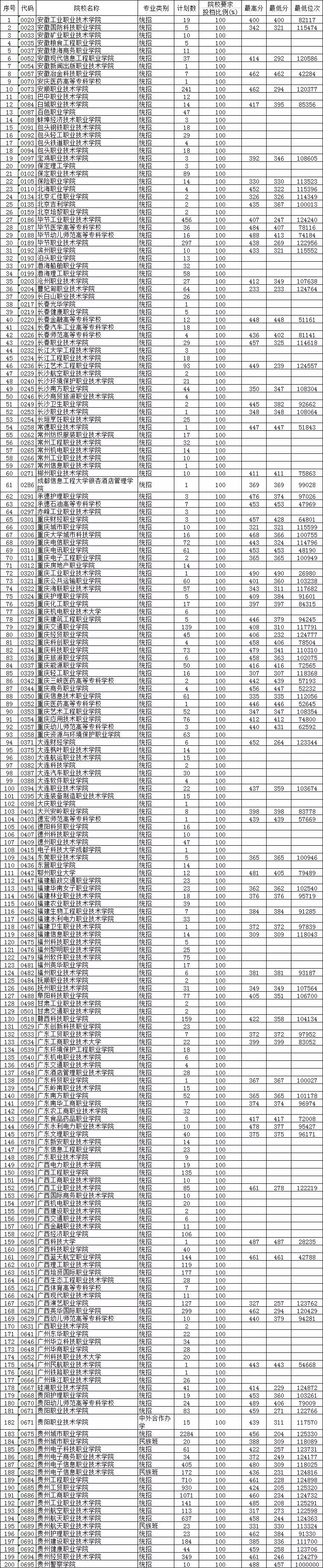 贵州省2019年高考高职(专科)文史类补报志愿投档情况