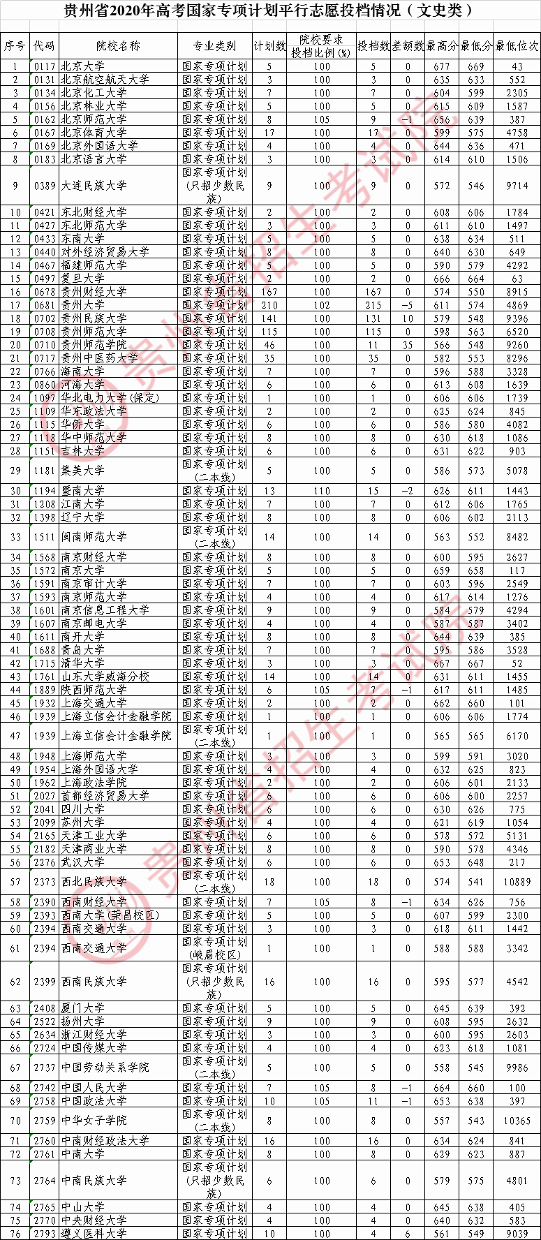 贵州省2020年高考国家专项计划平行志愿投档情况(文史类)