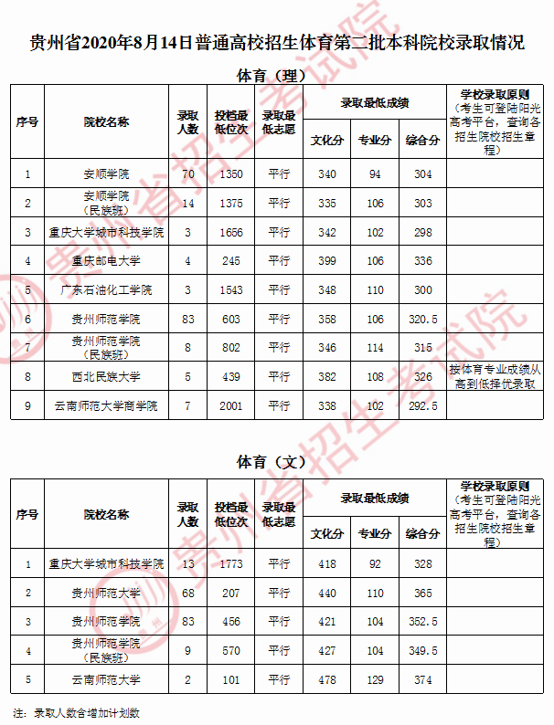 2020年8月14日贵州体育第二批本科院校录取分数线