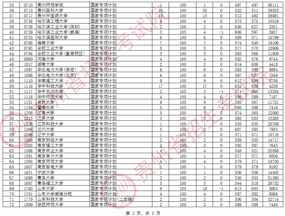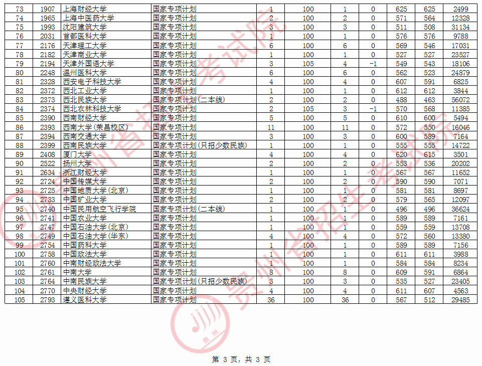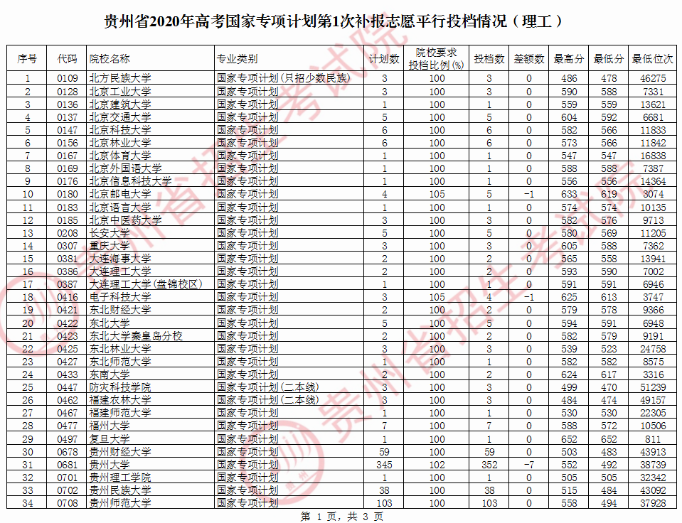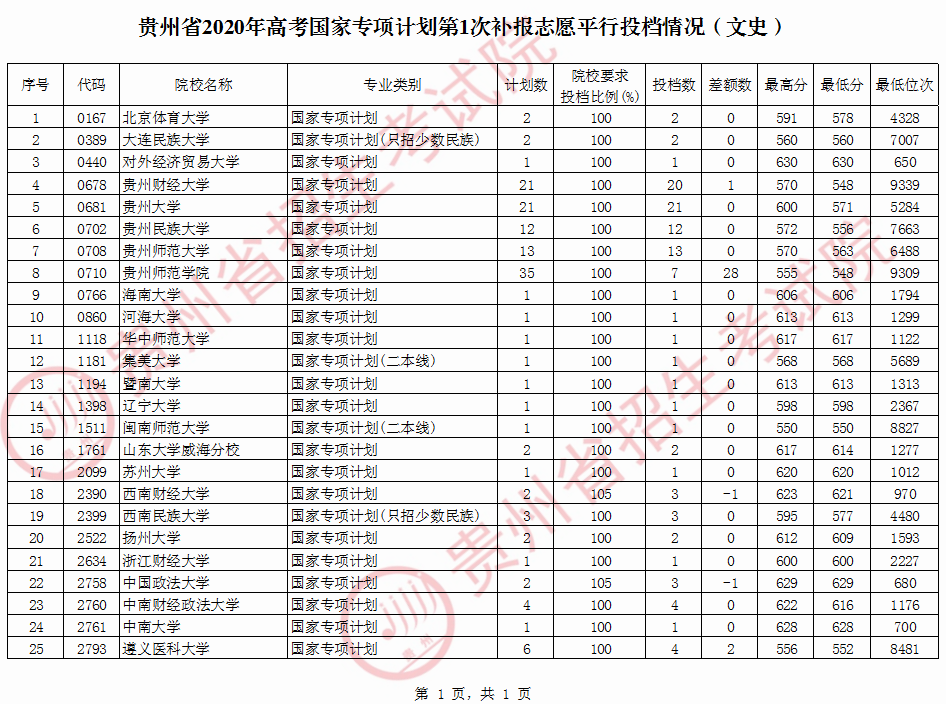 2020贵州高考国家专项计划第1次补报志愿平行投档分数线