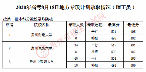 2020年贵州高考8月18日地方专项计划录取分数线(理工类)