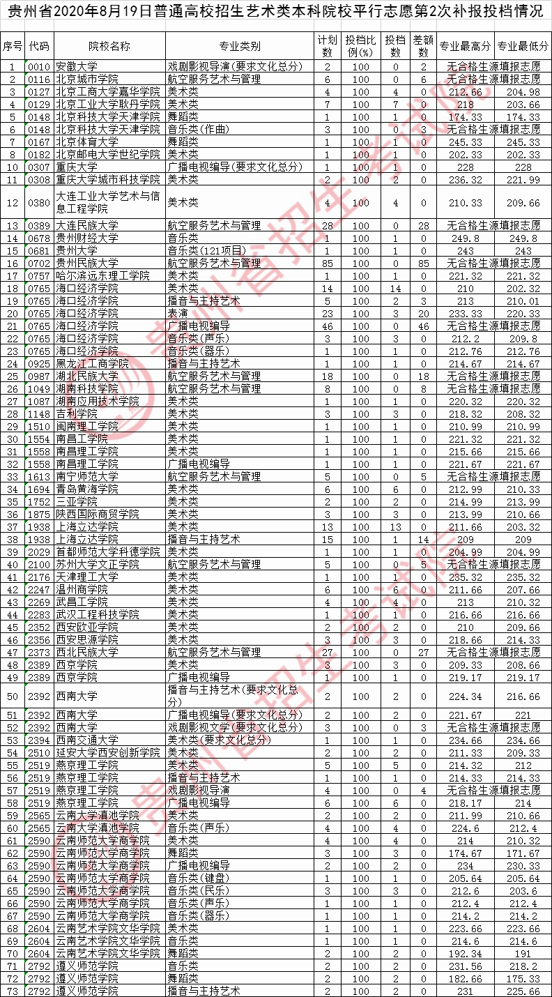 贵州省2020年8月19日普通高校招生艺术类本科院校平行志愿第2次补报投档情况