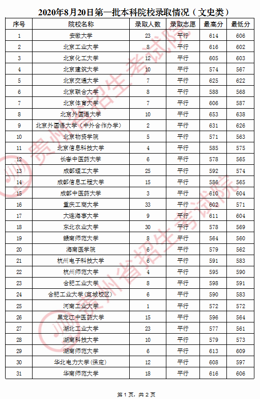 2020年8月20日贵州一本院校录取分数线情况(文史类)