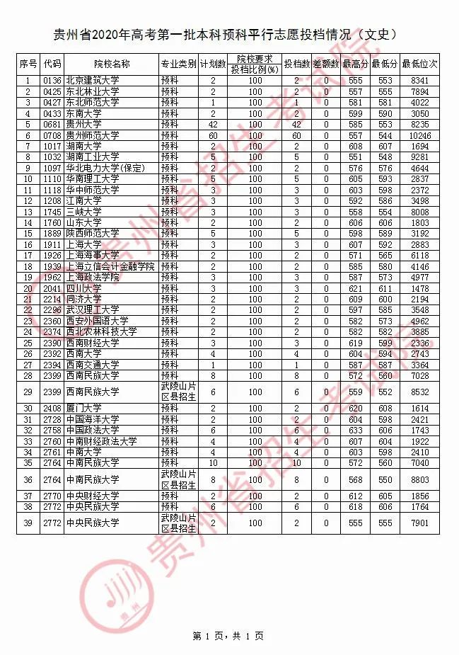 贵州省2020年高考第一批本科预科平行志愿投档情况