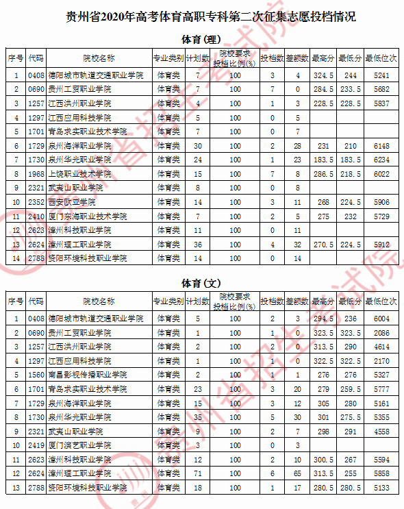 2020贵州体育高职专科第二次征集志愿投档分数线