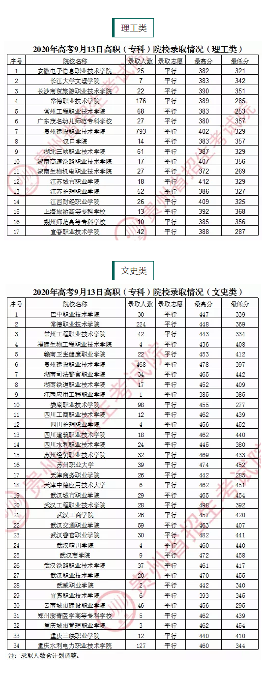 贵州:9月13日普通高校招生高职(专科)院校录取情况