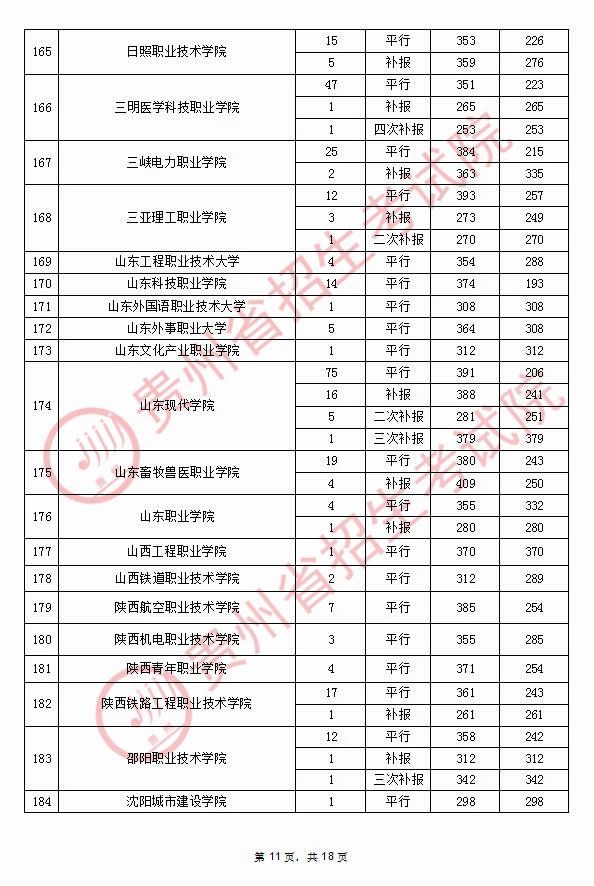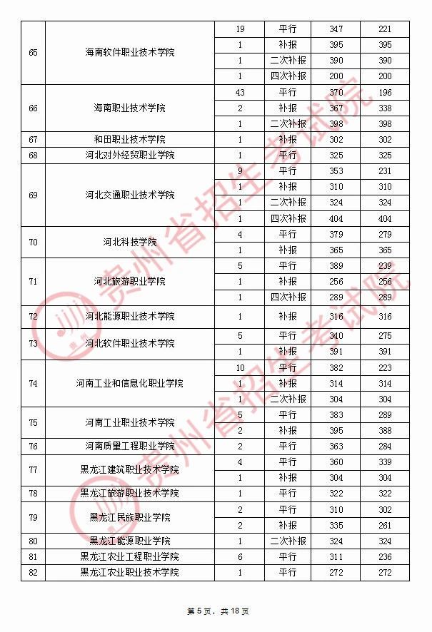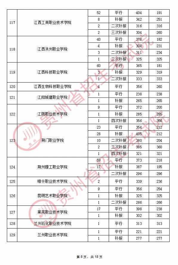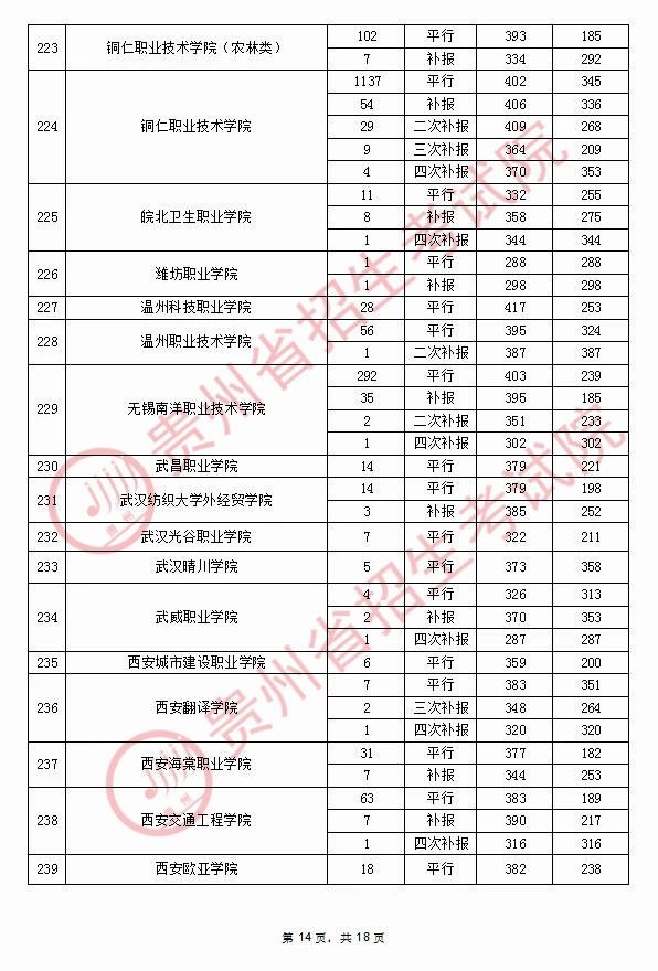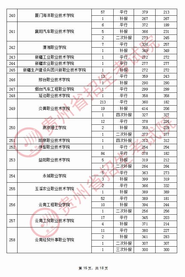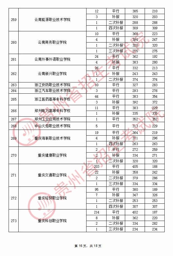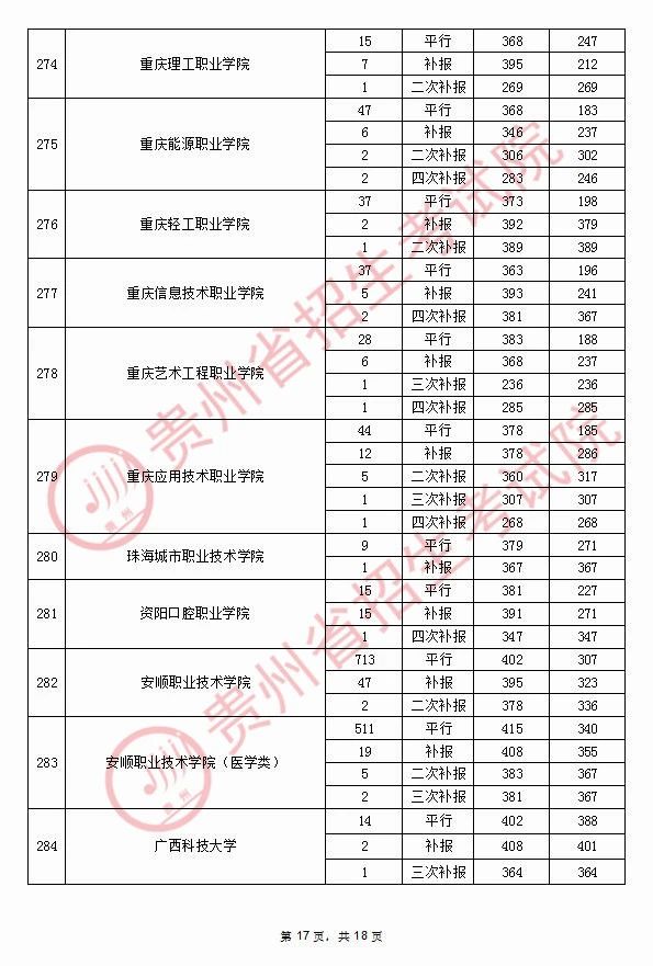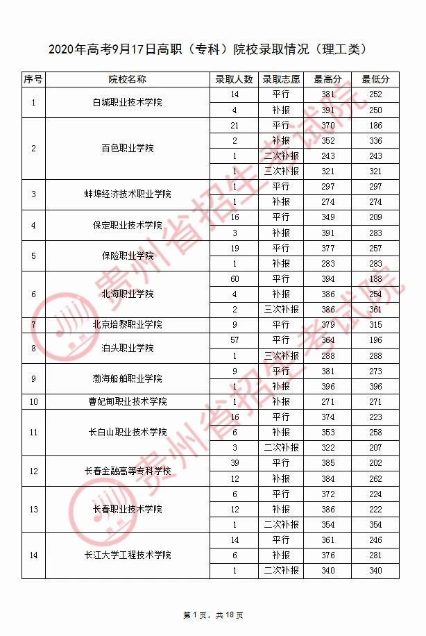 2020年9月17日贵州高考专科院校录取分数线(理科)